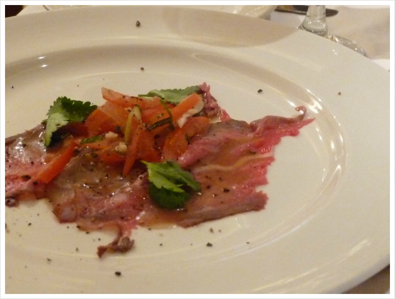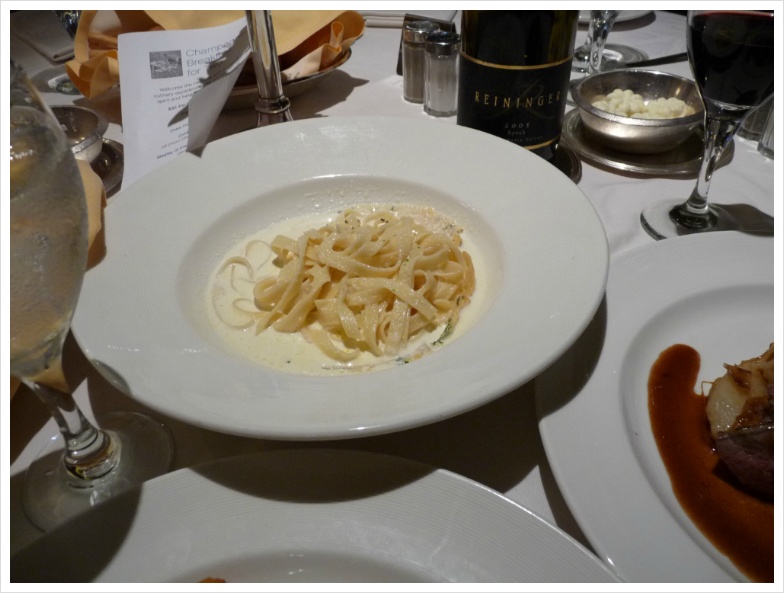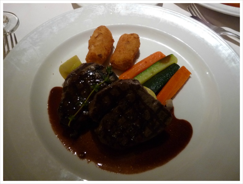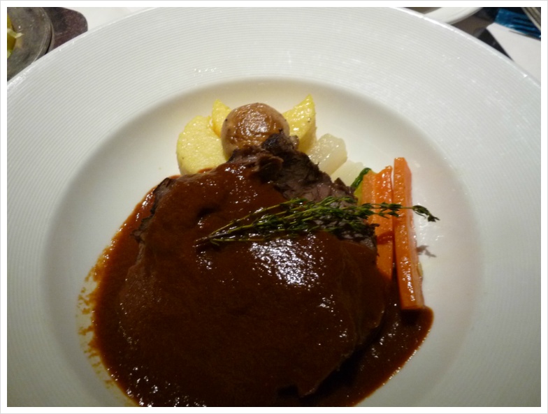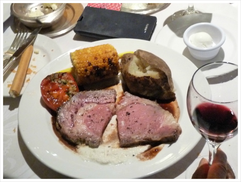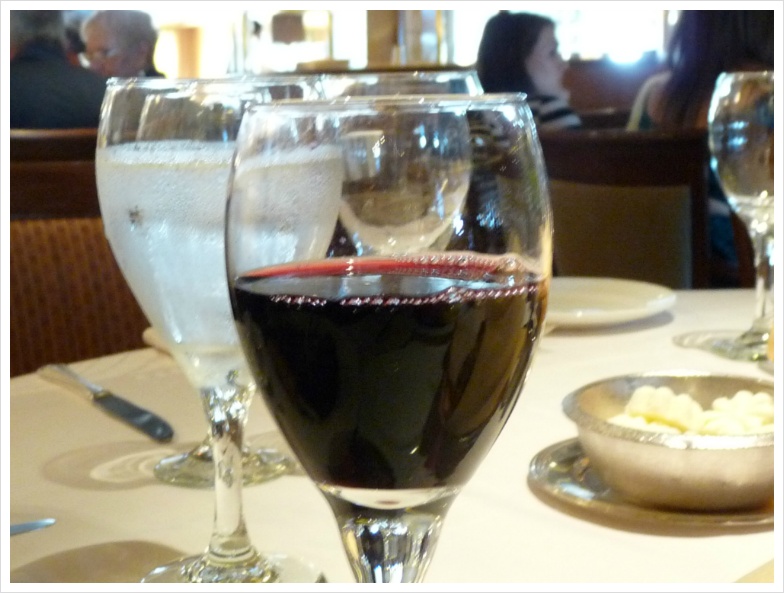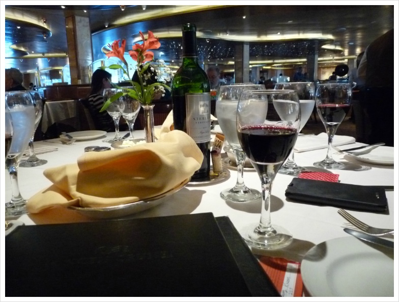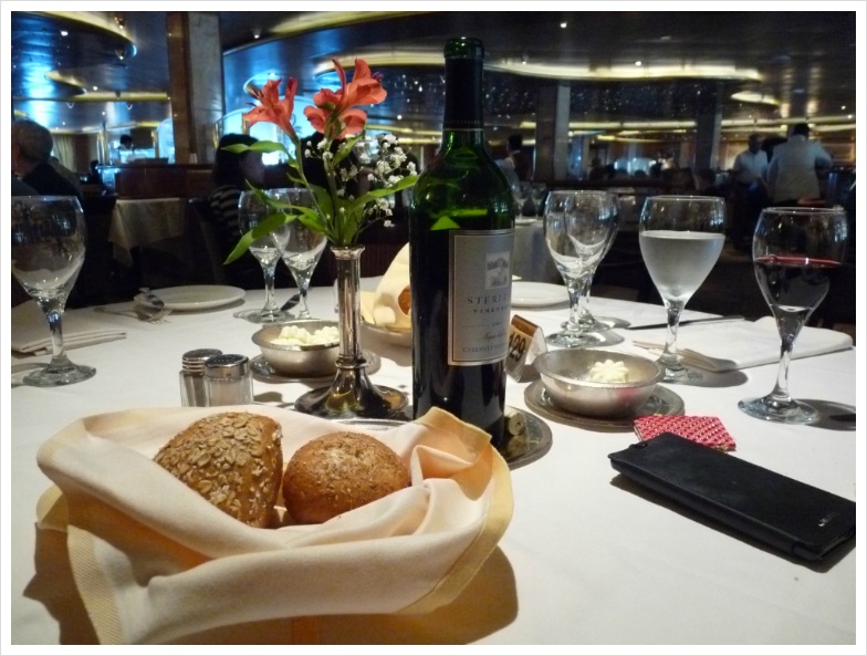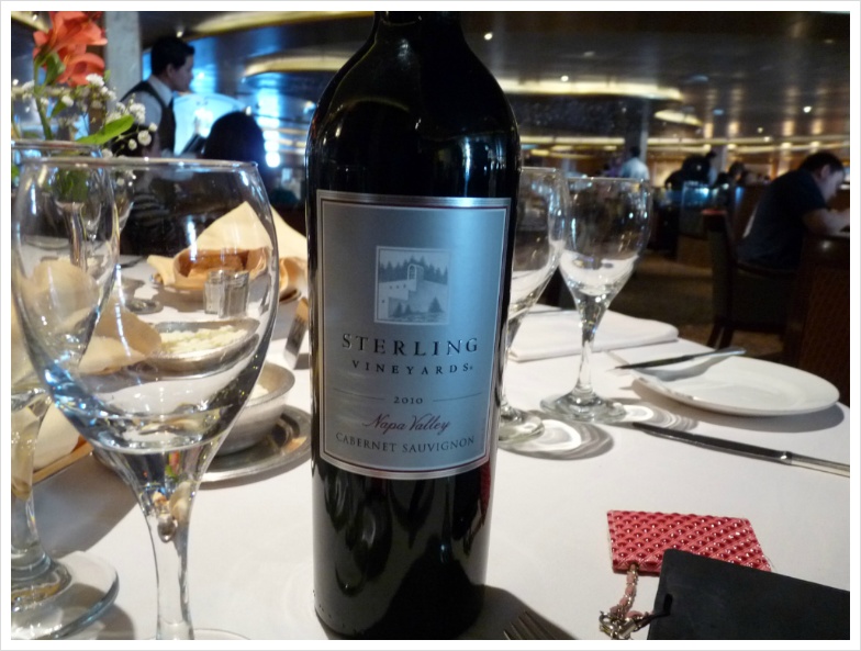 이런 저런 음식에 대한 '이야기'들은 사진으로 충분히 설명이 되겠지만, 저는 지금부터 늘 그랬듯, 크루즈 기간동안 즐긴 와인들에 대해 설명하려 합니다. 정찬 식당인 그랜드 프린세스의 '다 빈치' 레스토랑에는 저와 이모, 그리고 이모부만 앉게 배정이 된 테이블이 있었고, 우리는 며칠 동안 여기서 저녁과 와인을 즐겼습니다. 비교적 많은 식구가 같이 움직일 때는 식사시간이 정해져 있는 것이 좋고, 그렇지 않다면 자유롭게 식사시간을 선택하는 것이 무방합니다. 아무튼 기대가 많았던 첫날, 제가 선택한 와인은 캘리포니아의 강자 '스털링' 이었습니다. 아마 캘리포니아 와인을 좋아하는 분이라면 스털링 와인에 대해 들어보셨으리라 생각합니다. 화려합니다. 옆 테이블의 정장을 차려 입은 백인 아주머니가 우리 와인을 보고서 남편에게 "나도 저거 좋아해!"라고 외치던 기억이 생생합니다. 캘리포니아의 뜨거운 햇살을 담은 듯 화려하게 퍼지면서도 미끄럽다고 느껴질 정도의 세련된 태닌, 그리고 적절한 산도가 잘 어울린 와인입니다. 당연히 고기에 잘 가겠지요. 제가 이날 선택한 요리는 비프 룰라덴. 독일 식 스테이크인데, 아주 얇게, 그리고 넓게 저민 고기를 약간 양념하여 이를 돌돌 말아 구운 요리입니다. 뭐, 사실 이런 구분이 별로 의미가 없었던 것이, 이모와 이모부가 입이 짧으셔서, 음식을 버리는 것에 대해 죄책감을 갖고 있는 제가 '도와 드리느라' 이것저것 다 먹어 버리는 바람에 ^^;