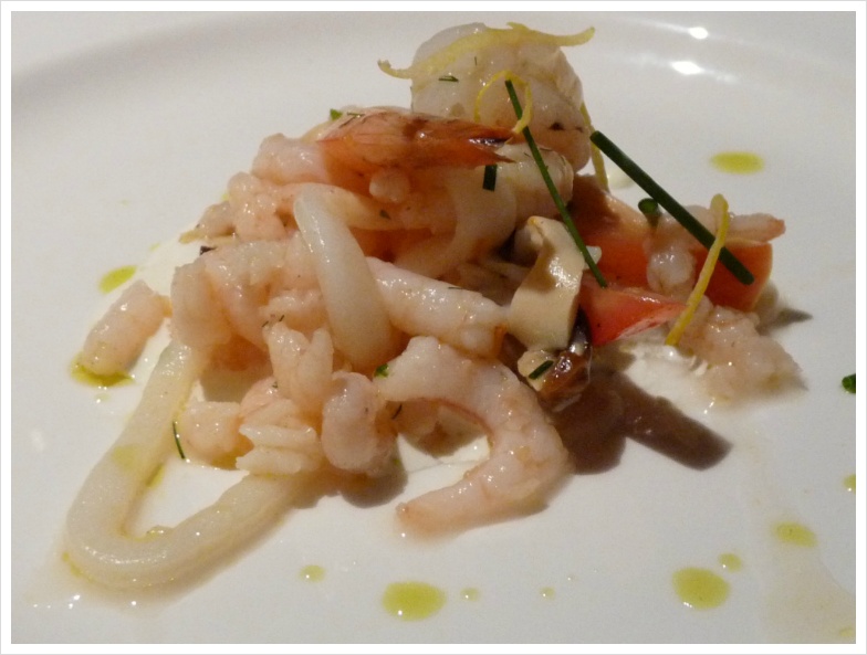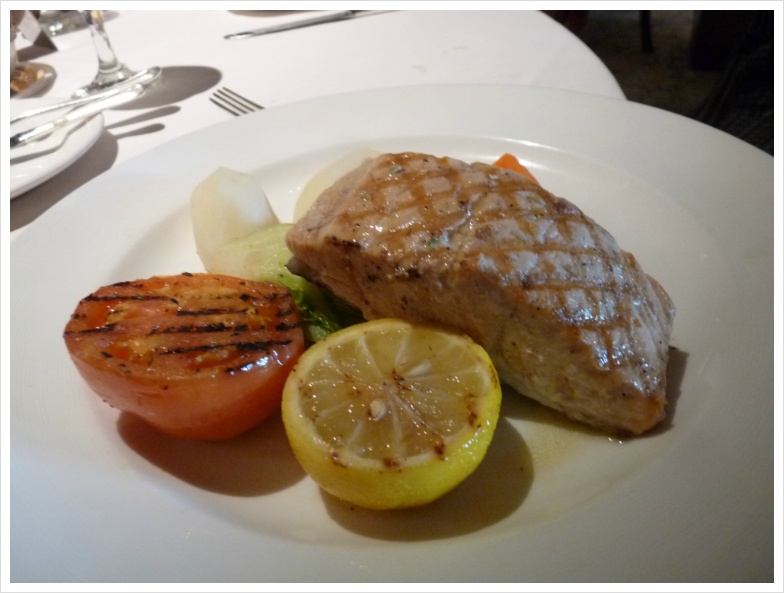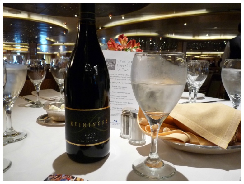 그 다음 날엔 생선 요리가 주로 나왔기에, 이번엔 배 안에서 파는 호그의 리즐링을 시켰습니다. 솔직히 육지에서 마시면 7달러가 채 안되는 가격에 마실 수 있지만, 여기서는 이게 병당 24달러에 팔리고 있더군요. 그럼에도 불구하고 이 와인이 갖는 포텐셜을 분명히 알고 있기에 주저없이, 망설이지 않고 시켰습니다. 워싱턴주와 리즐링은 거의 '떼어 놓을 수 없는' 관계지요. 리즐링의 고향이라 할 수 있는 독일 다음으로 리즐링 포도가 가장 많이 자라는 곳이 워싱턴주이고, 그만큼 다양한 리즐링을 생산합니다. 가격도 저렴하면서 최상의 품질의 리즐링을 만들어 내는 곳. 그리고 여기서 가장 '컨수머 프렌들리'한 와이너리인 곳이 호그입니다. 칵테일 새우와 해물 샐러드, 그리고 무지개 송어와의 조합은 일품이었습니다.