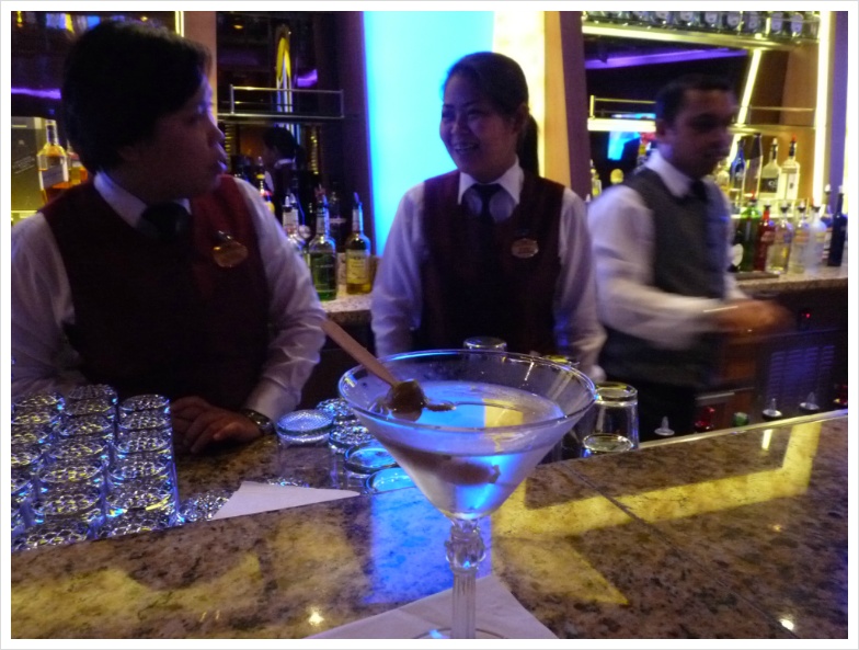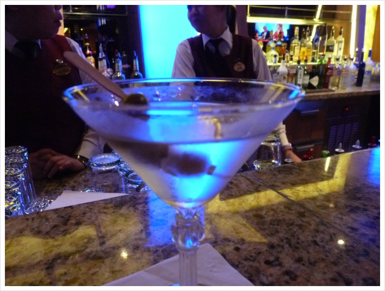 그 다음날은 배 바깥에서 맥주 엄청 마시고 온 탓에 와인은 패스. 그리고 그 다음날엔 바에서 마티니를 시켜 마셨는데, 왜 제임스 본드가 그 유명한 대사, "마티니, 흔들지 말고, 저어서." 라고 말했는지를 온 몸으로 실감했습니다. 바텐더는 봄베이 사파이어 마티니를 시킨 제 앞에서 셰이커에 '갈은 얼음을 넣고', 버무스를 '한 잔 가득 따라서 넣고' 흔들어대기 시작했습니다. 마티니에 얼음이라니! 저는 제빨리 제지하려 했지만 그녀의 손은 빨랐습니다. 이미 제 앞엔 시원해 보이는 마티니 -_-; 가 따라졌고, 저는 그걸 홀짝거리기 시작했습니다. 아, 내가 마티니 마시고 싶다고 했지 소주 마시고 싶다고 했냐.... 결국 저는 배의 면세점에서 봄베이 사파이어 한 병을 샀고, 그것은 퇴선하기 전날 제 선실 앞 문에 배달되어 놓여졌고, 제가 우리집 오자마자 처음 한 짓이 스윗 마티니를 제 식으로 만들어 홀짝거리는 거였습니다. 얼마나 한이 맺혔으면 -_-;