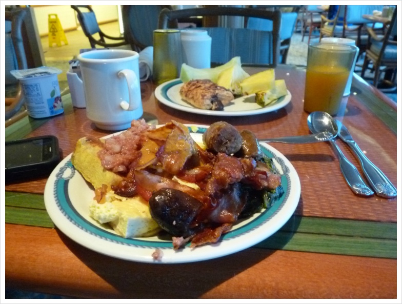 이곳의 부페는 오전 5시부터 열어 자정까지 문을 열고, 중간중간 브레이크 타임을 두는 형식으로 운영됐습니다. 보통 아침 5-6시 사이엔 컨티넨탈 브렉퍼스트 형태로 운영되고, 오전 6시가 되어야 아침 부페를 시작한다고는 해 놓았지만, 매일 새벽 5시에 일어나 밥을 먹으러 간 저는 받을 서브 다 받고, 차와 커피도 그들이 직접 서브해주는 경우가 더 많아 솔직히 많이 미안했습니다. 접시에 음식을 채우고 아무 테이블에나 가서 앉으면 서버들이 와서 커피와 쥬스, 혹은 레모네이드를 따라놓고 가고, 기호가 뭔지를 물어 옵니다. 커피를 제공하는 머신엔 커피와 디카페인 커피, 아이스티, 뜨거운 물이 제공되는데, 이중 뜨거운 물은 당연히 차를 마시게 하도록 하기 위한 것이고, 트와이닝이나 비질로우의 티백이 무제한으로 제공되고 있었습니다. 그 옆엔 미리 썰어놓은 레몬을 잔뜩 갖다 놓아서, 차에 레몬을 넣어 마시고 싶어하는 사람들을 배려했습니다.
