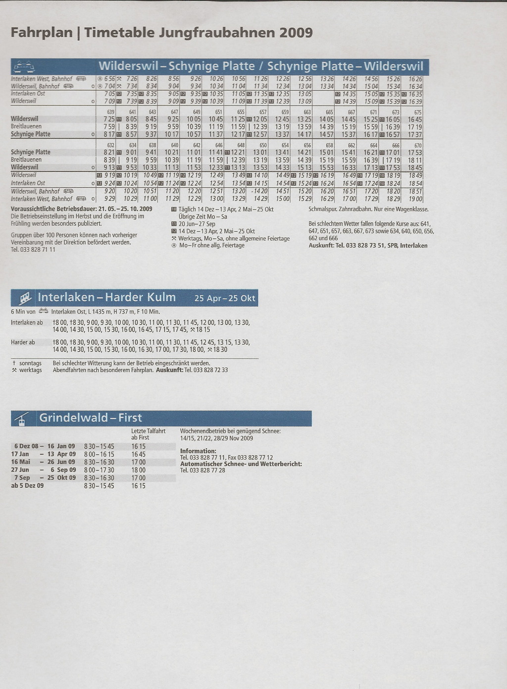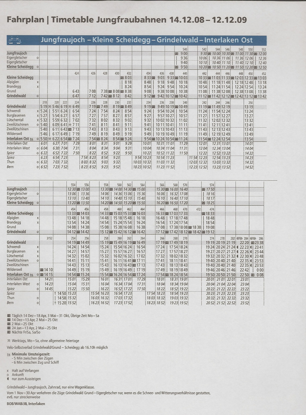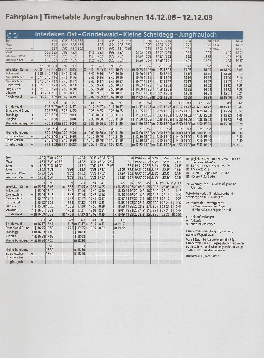 2009년 융프라우 산악열차 운행 시간표