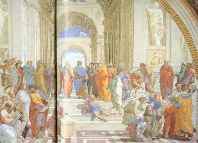 라파엘은 교황의 방을 장식하는데 종교화가 아닌 그리스 철학자를 왜 그렸을까? 우리는 이 시대가 르네상스 시대라는 것을 염두에 두고 보면 이해가 갈 것이다. 르네상스는 그리스-로마 시대의 학문과 예술을 탐구하던 시대였다.