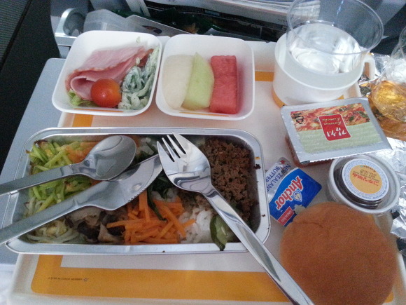->얼마 지나지 않아 기내식이 나왔다. 보통 유럽의 기내식은 치킨과 소고기가 많이 나온다하더니 여기도 그러했다.그렇지만 나는 비빔밥을 시켰다. 경험상 기내식에 나오는 고기들은 무척 느끼하다. 아기자기한 식기들과 반찬들이 구미를 당겼다. 샐러드도 나름 먹을만 했다.