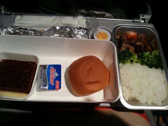 ->다음 식사엔 비빔밥이 제공되지 않았다. 그래서 소고기 요리를 시켰다. 오랜 비행에 지친 다음이라 입맛도 없어서 무슨 맛인지도 모르겠다. 빵은 항상 함께 제공되고, 디저트로 브라우니케이크가 나왔다. 엄청 달았다.