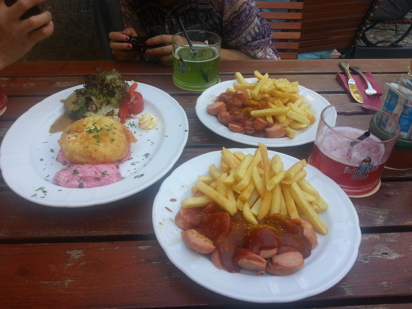 장벽을 보고 난 뒤 티비타워를 랜드마크 삼아 걸어 걸어 걸어서(정말 한시간은 걷기만 한 듯) 민박집 사장님이 알려준 식당에 도착했다. 지도가 없으니 참으로 난감한 길찾기였다. 베를린은 카레부르스터라는 소세지 요리가 유명하다 해서 시켜 보았다. 그리고 그 식당에서 유명하다는 맥주도 시켰다. 나는 라즈베리맛을 먹었는데, 맛있었다.