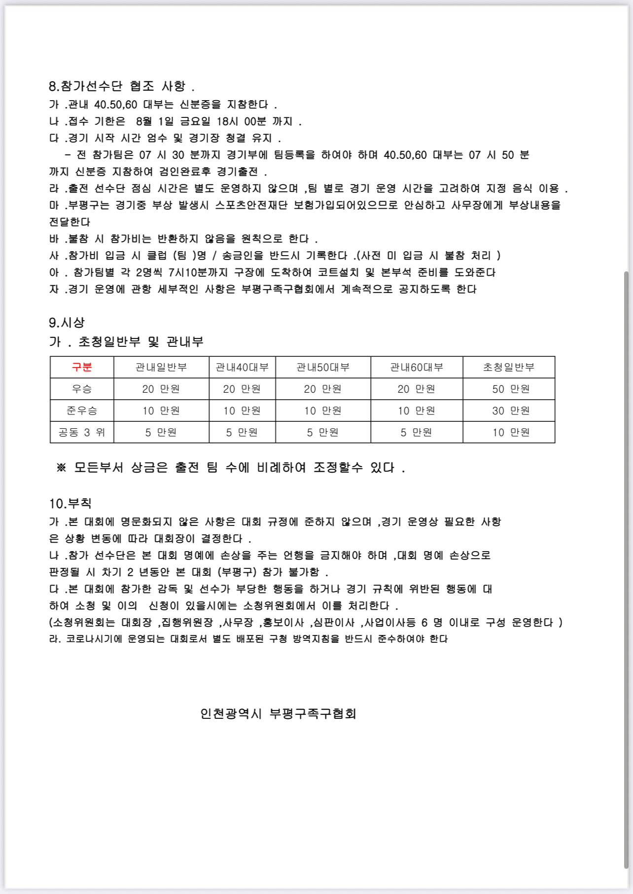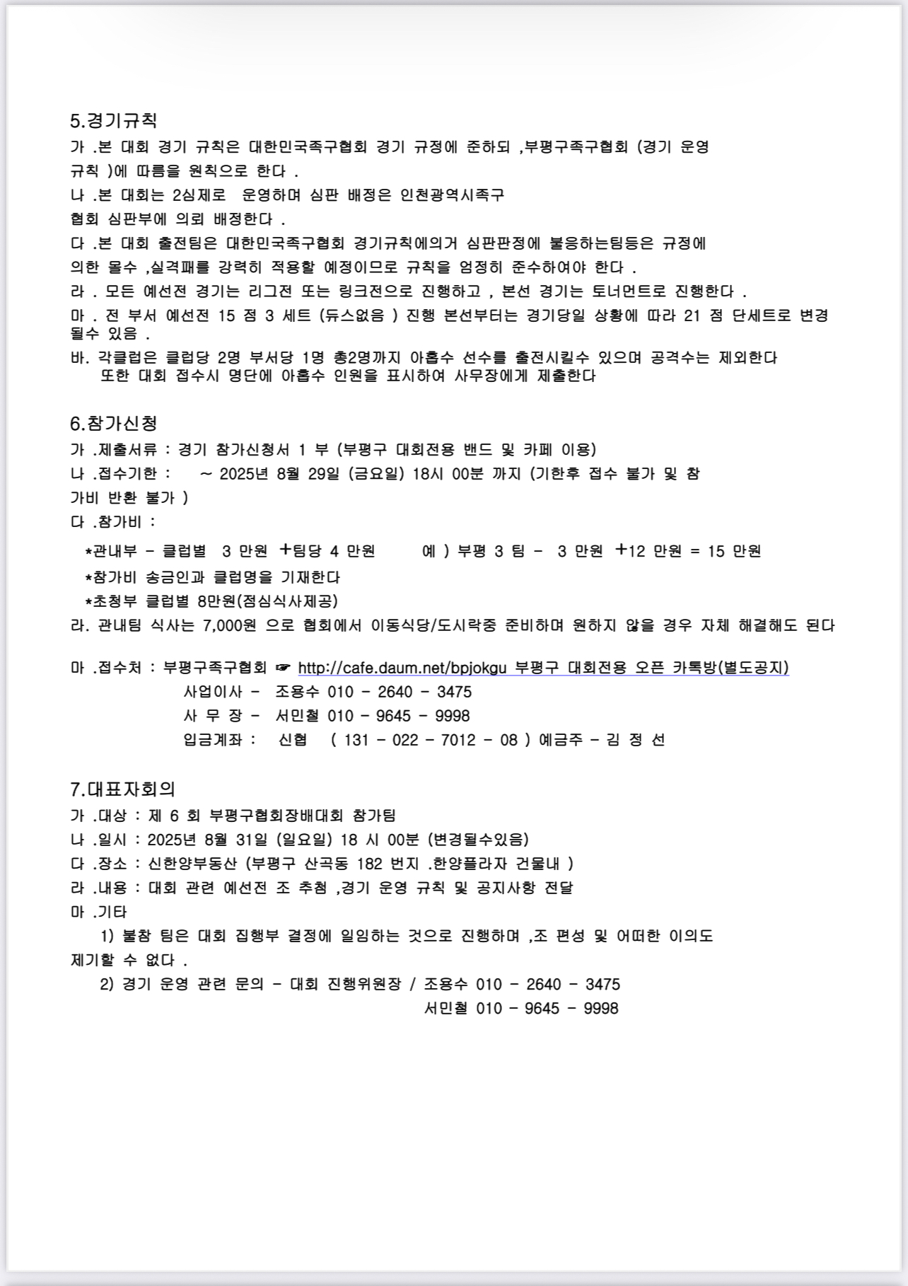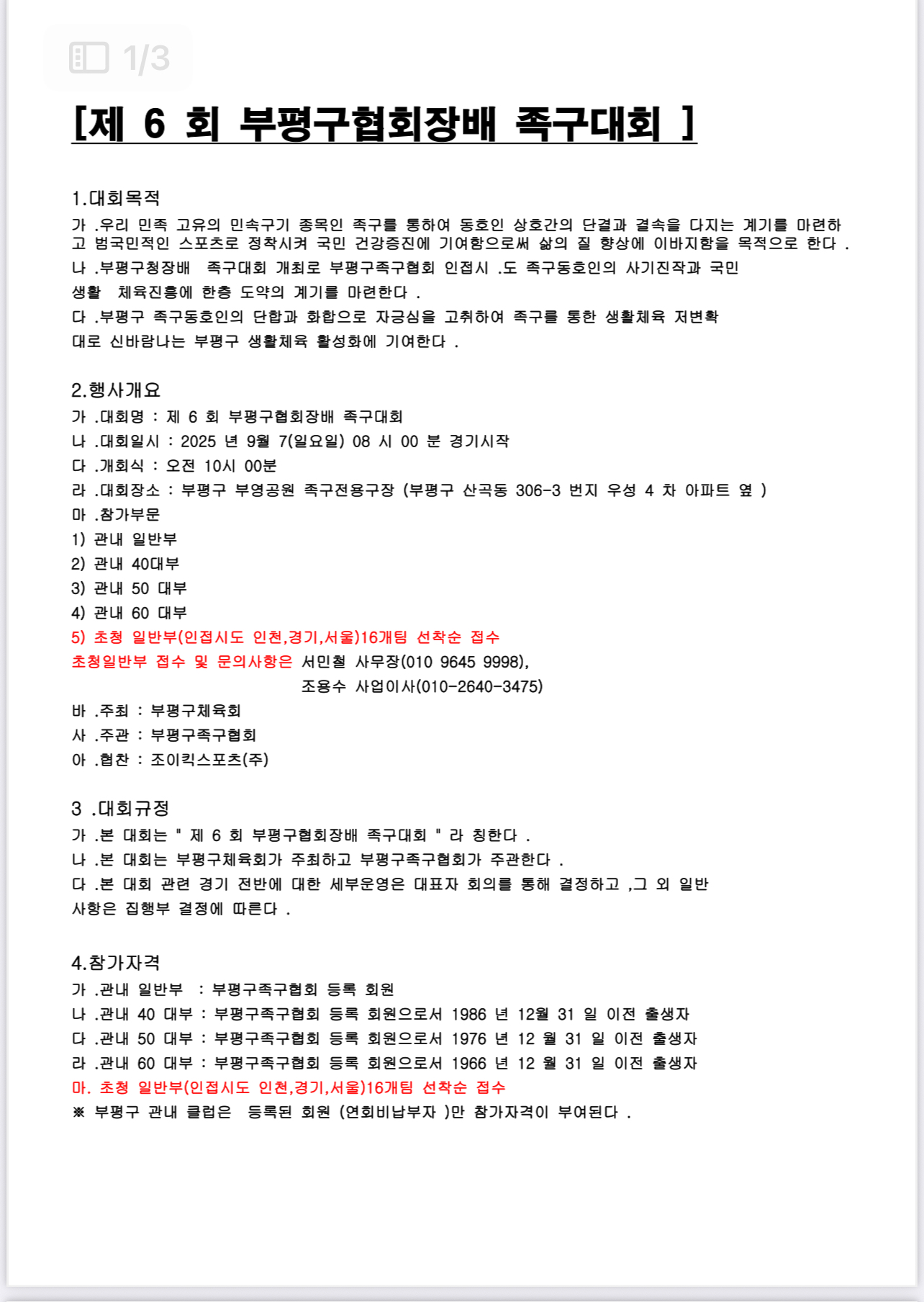 제6회 부평구 협회장배 족구대회 요강 작성자김정선|작성시간25.08.04|조회수146 목록 댓글 2 글자크기 작게가 글자크기 크게가 다음검색 현재 게시글 추가 기능 열기 북마크 공유하기 신고 센터로 신고 댓글 댓글 2 댓글쓰기 답글쓰기 댓글 리스트 작성자윤창옥ㅇ | 작성시간 25.08.06 화이팅입니다~!!! 답댓글 작성자김정선 작성자 본인 여부 작성자 | 작성시간 25.08.12 댓글 전체보기