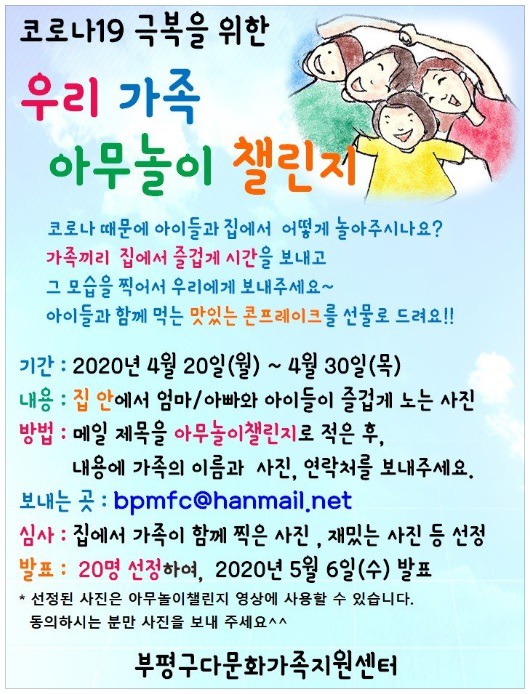 방법 : 메일 제목을 아무놀이챌린지로 적은 후, 내용에 가족의 이름과 사진, 연락처를 보내주세요.