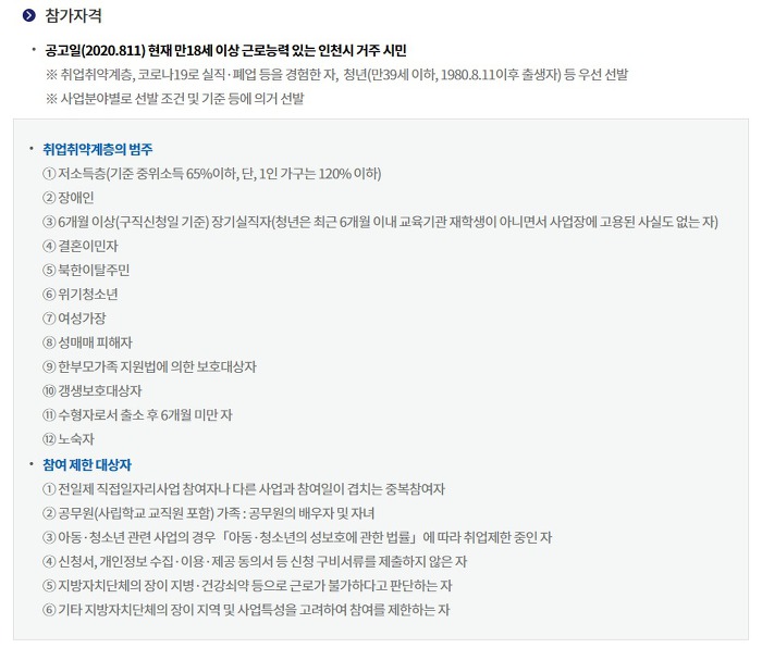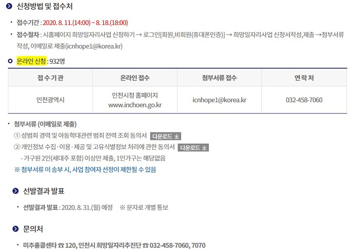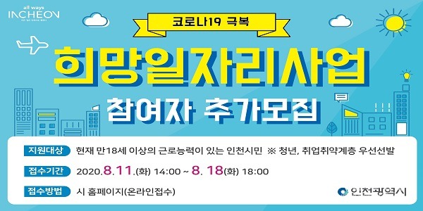 「코로나19 극복 인천 희망일자리 사업 참여자 추가모집 안내」 작성자부평구다문화|작성시간20.08.12|조회수429 목록 댓글 0 글자크기 작게가 글자크기 크게가 「코로나19 극복 인천 희망일자리 사업 참여자 추가모집 안내」접수기간 : 2020. 08. 11.(화) 14:00 ∼ 08. 18.(화) 18:00근로기간 : 2020. 09. 01.(화) ~ 11. 30.(월) 신청대상 : 공고일(2020.8.11.) 현재 만18세 이상 근로능력 있는 인천시 거주 시민신청방법 : 인천시 홈페이지 (온라인 신청) https://www.incheon.go.kr/apply/AP020101 다음검색 현재 게시글 추가 기능 열기 북마크 공유하기 신고 센터로 신고 댓글 댓글 0 댓글쓰기 답글쓰기 댓글 리스트