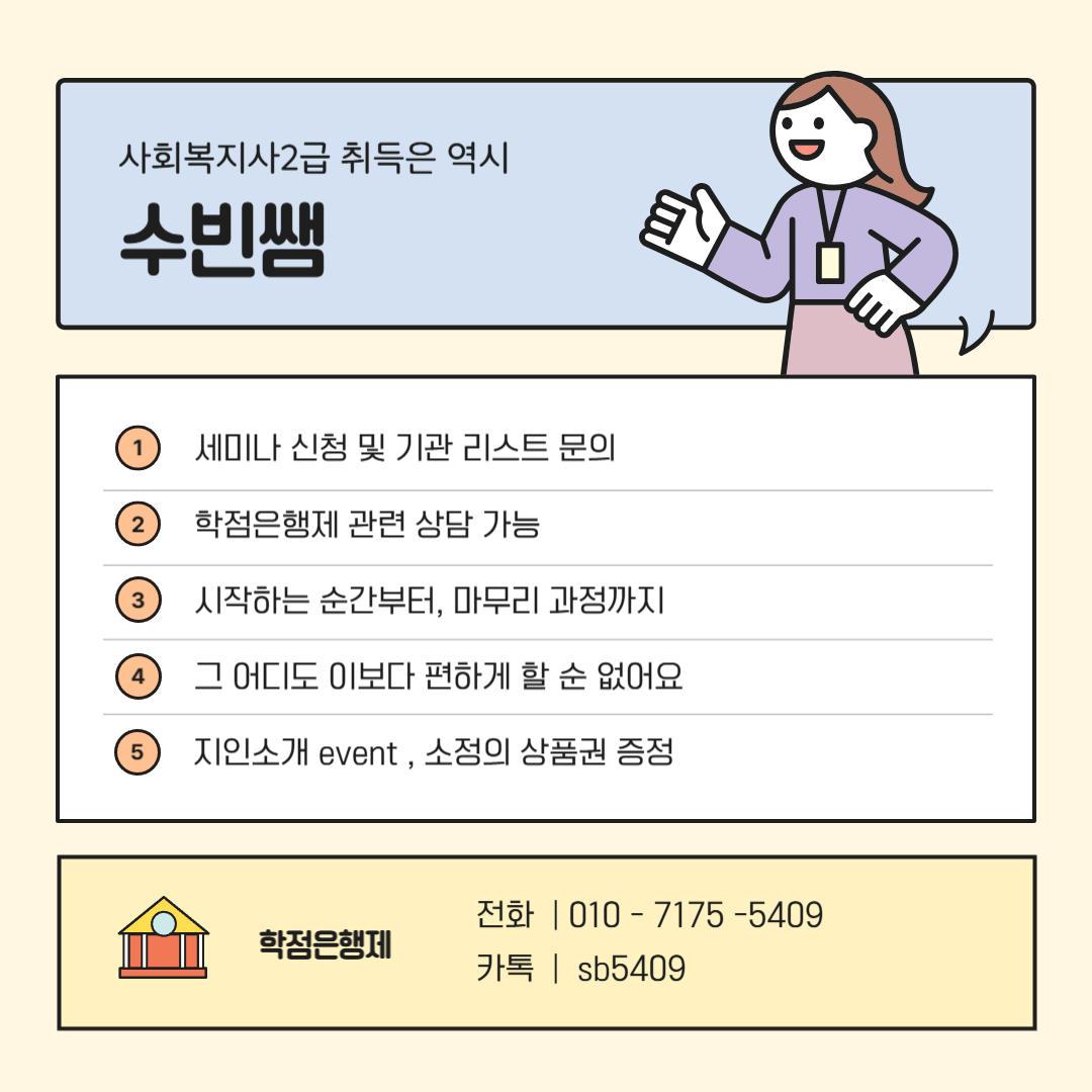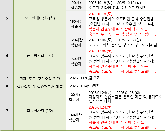 대구, 경산, 고령, 군위, 의성, 청도 사회복지현장실습 10/15 개강반 모집합니다 1. 접수기간 : 선착순 모집 ~ 10/14 2. 개강 : 2025.10.15 (수) / 종강 : 2026.01.27(화) 3. 실습인정기간(11주) : 2025.10.20(월) ~ 2026.01.09(금)까지 4. 실습시간 : 구법 120시간 / 신법 160시간 * 2020년 이전에 자격증 과목을 하나라도 이수하였으면 120시간이며, 그 외에는 무조건 160시간 * 실습기관에서의 1일 실습시간은 최소 4시간 ~ 8시간으로 진행해야 인정됨. 5. 세미나 수업 |