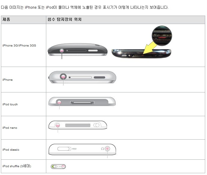 아이폰의 이어폰 단자 안쪽을 유심히 보세요.....핑크색으로 보인다면 침수라벨이 반응한 것입니다..