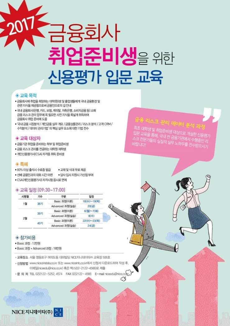 [NICE]2017 금융회사 취업을 위한 신용평가 입문교육 작성자NICE평가정보(주)|작성시간17.02.06|조회수21 목록 댓글 0 글자크기 작게가 글자크기 크게가 2017 신용평가입문교육_리플렛.pdf 2017_신용평가입문교육신청서.docx 첨부파일첨부된 파일이 3개 있습니다. jpg 파일 2017_신용평가입문교육_포스터(jpg).jpg 다운로드 pdf 파일 2017 신용평가입문교육_리플렛.pdf 다운로드 docx 파일 2017_신용평가입문교육신청서.docx 다운로드 다음검색 현재 게시글 추가 기능 열기 북마크 공유하기 신고 센터로 신고 댓글 댓글 0 댓글쓰기 답글쓰기 댓글 리스트