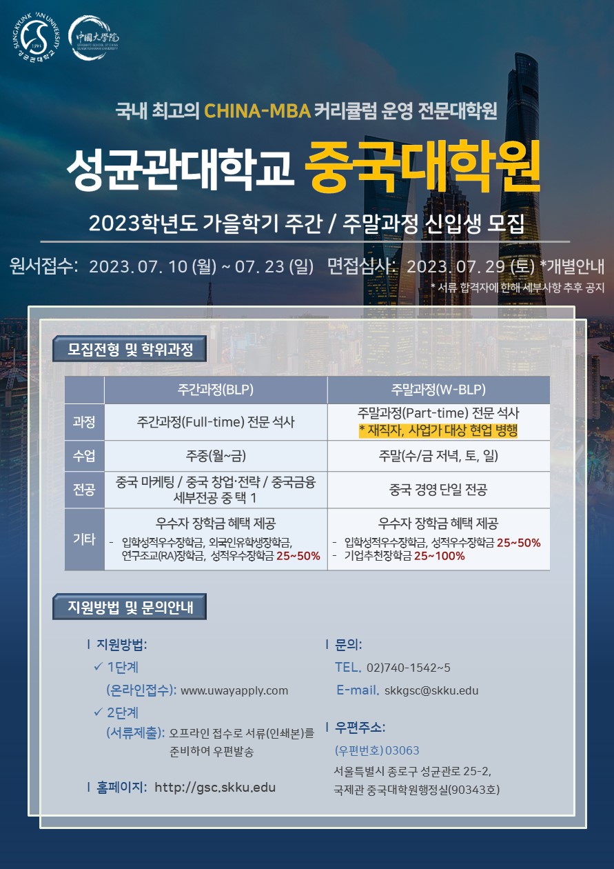 [성균관대학교 중국대학원] 가을학기 CHINA-MBA 커리큘럼 석사학위과정 주간/주말과정 신입생 모집! (~07/23)