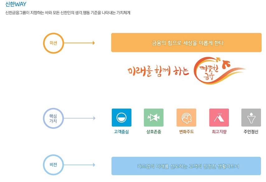 신한카드라는 회사의 미션, 핵심가치, 비전을 정리해놓은 것으로,