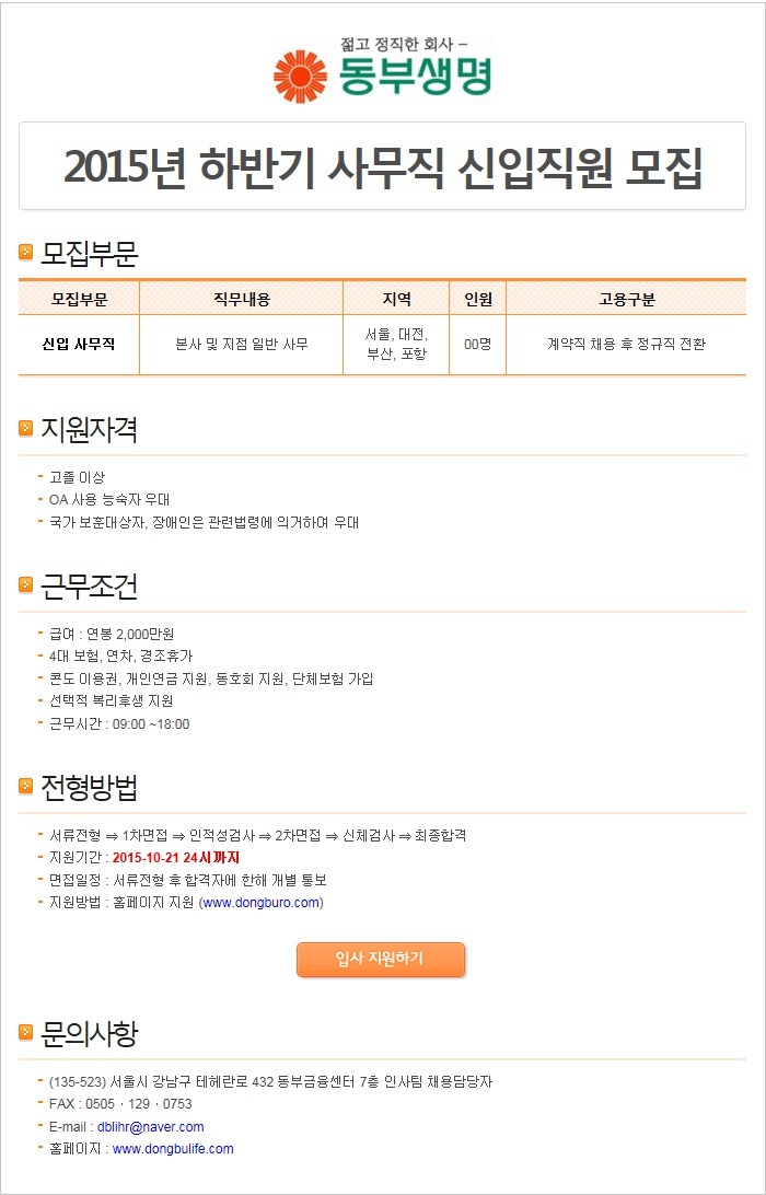 [동부생명보험 채용]동부생명보험 채용 2015 하반기 신입사원 모집(10/15~10/21)