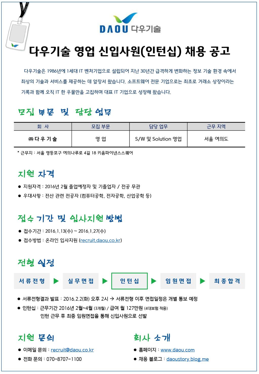 [다우기술] 영업 신입사원 채용 공고 (~1/27,수) 작성자다우기술 채용담당자2|작성시간16.01.25|조회수96 목록 댓글 0 글자크기 작게가 글자크기 크게가 2016년 다우기술 영업 신입사원(인턴십) 채용 공고.pdf* 온라인 지원 : recruit.daou.co.kr 2016년 다우기술 영업 신입사원(인턴십) 채용 공고.pdf 첨부파일첨부된 파일이 1개 있습니다. pdf 파일 2016년 다우기술 영업 신입사원(인턴십) 채용 공고.pdf 다운로드 다음검색 현재 게시글 추가 기능 열기 북마크 공유하기 신고 센터로 신고 댓글 댓글 0 댓글쓰기 답글쓰기 댓글 리스트
