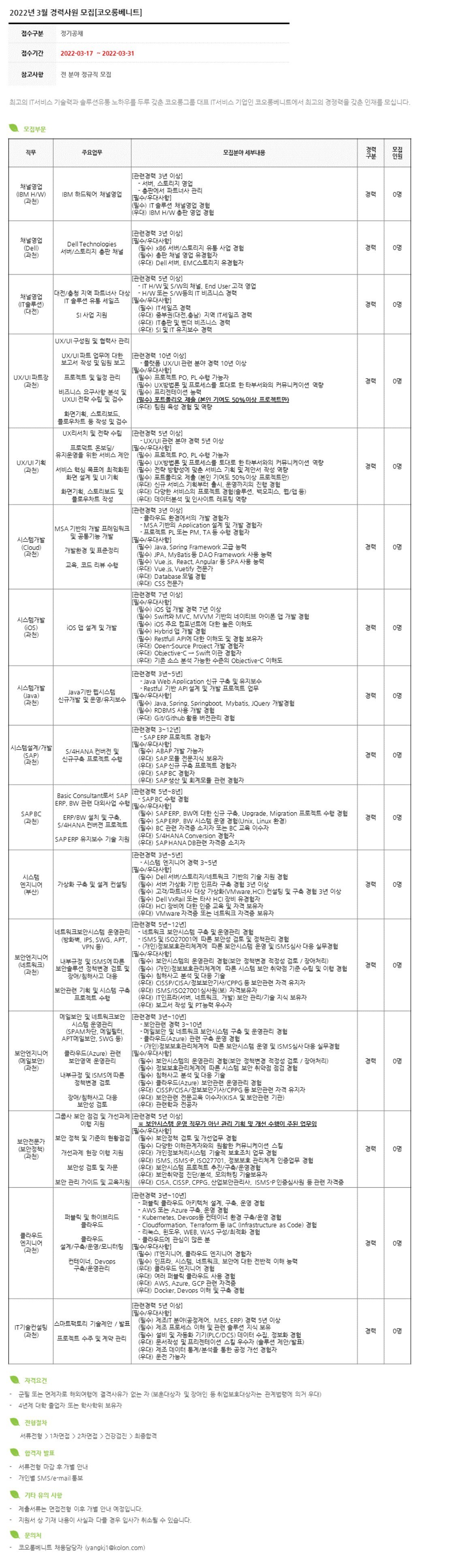 [코오롱베니트] 2022년 코오롱그룹 경력사원 3월 정기공채 (~03/31)