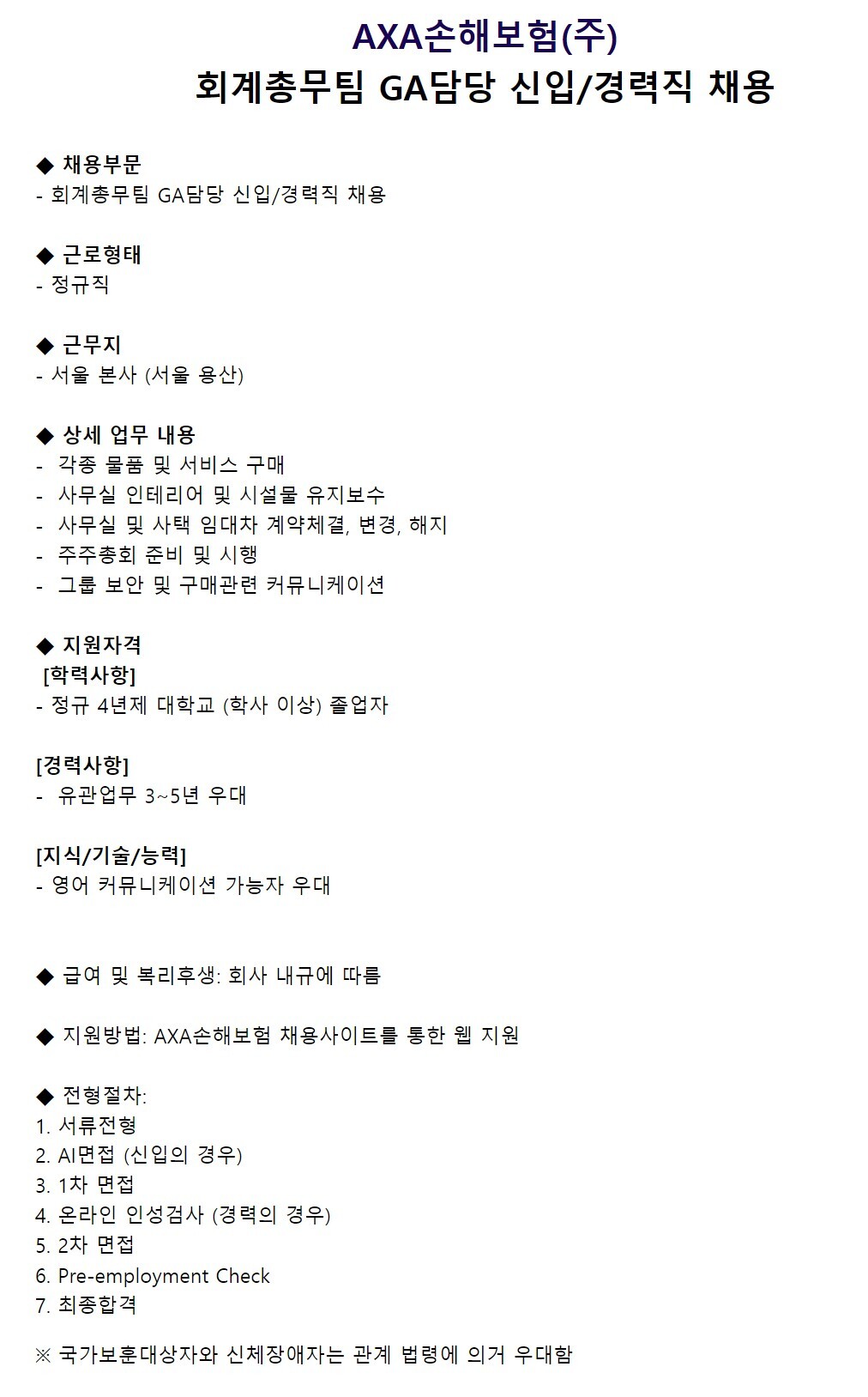 [AXA손해보험(주)] 회계총무팀 GA 담당 신입/경력 채용 (~05/29)