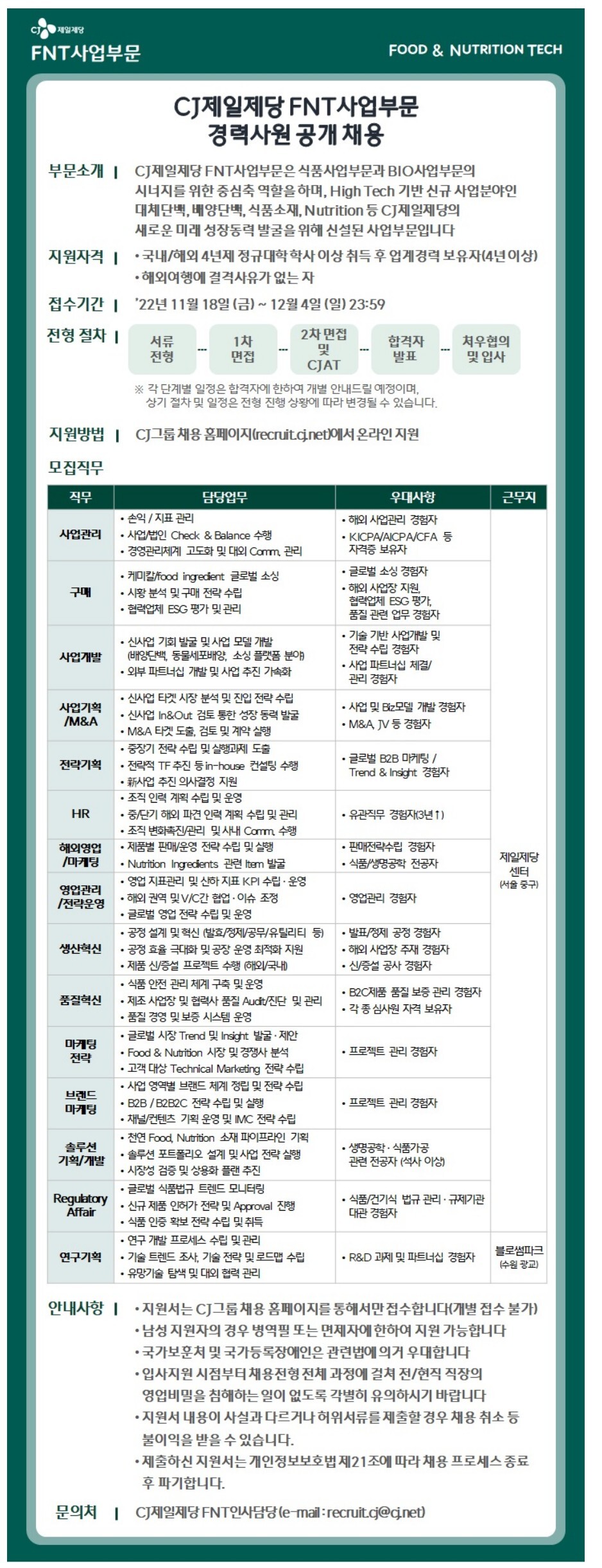 [CJ제일제당] FNT사업부문 경력사원 공개채용 (~12/04) 작성자취뽀 I 스탭 01|작성시간22.11.23|조회수26 목록 댓글 0 글자크기 작게가 글자크기 크게가 [CJ제일제당] FNT사업부문 경력사원 공개채용 (~12/04)📌접수기간 : 22.11.18(금)~ 22.12.04(일)📌고용형태 : 정규직📌접수방법 : 홈페이지 지원📌지원하기 : (클릭) 다음검색 현재 게시글 추가 기능 열기 북마크 공유하기 신고 센터로 신고 댓글 댓글 0 댓글쓰기 답글쓰기 댓글 리스트