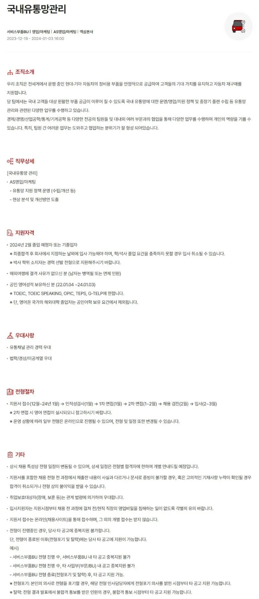 [현대모비스] 국내유통망관리 (~1/3) 작성자취뽀 I 스탭 01|작성시간23.12.21|조회수19 목록 댓글 0 글자크기 작게가 글자크기 크게가 [현대모비스] 국내유통망관리 (~1/3) 📌접수기간 : 23.12.20(수)~ 24.1.3(수) 📌고용형태 : 정규직📌접수방법 : 홈페이지 지원📌지원하기 : (클릭) 다음검색 현재 게시글 추가 기능 열기 북마크 공유하기 신고 센터로 신고 댓글 댓글 0 댓글쓰기 답글쓰기 댓글 리스트