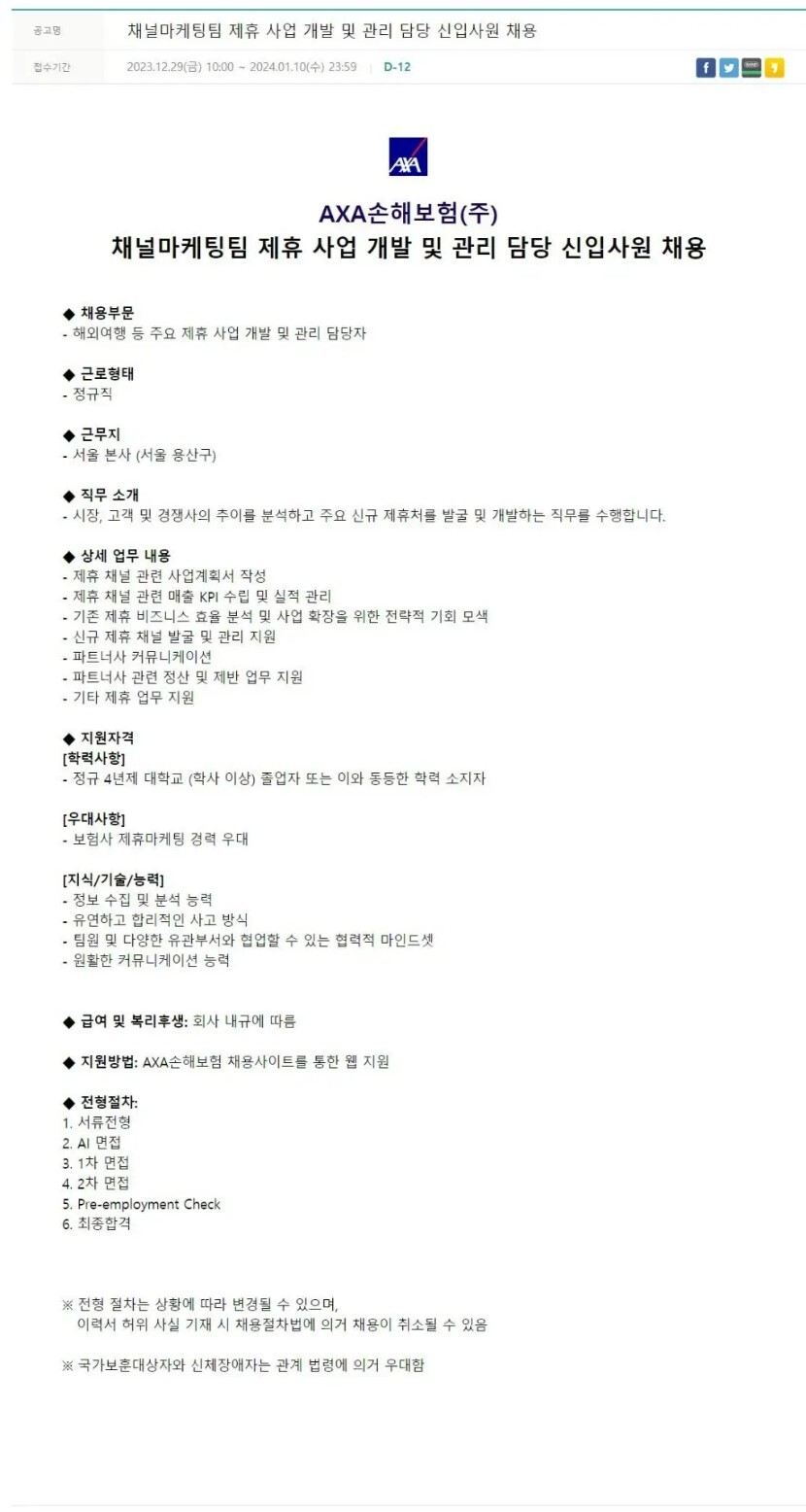 [AXA손해보험] 채널마케팅팀 제휴 사업 개발 및 관리 담당 신입사원 채용 (~1/8)