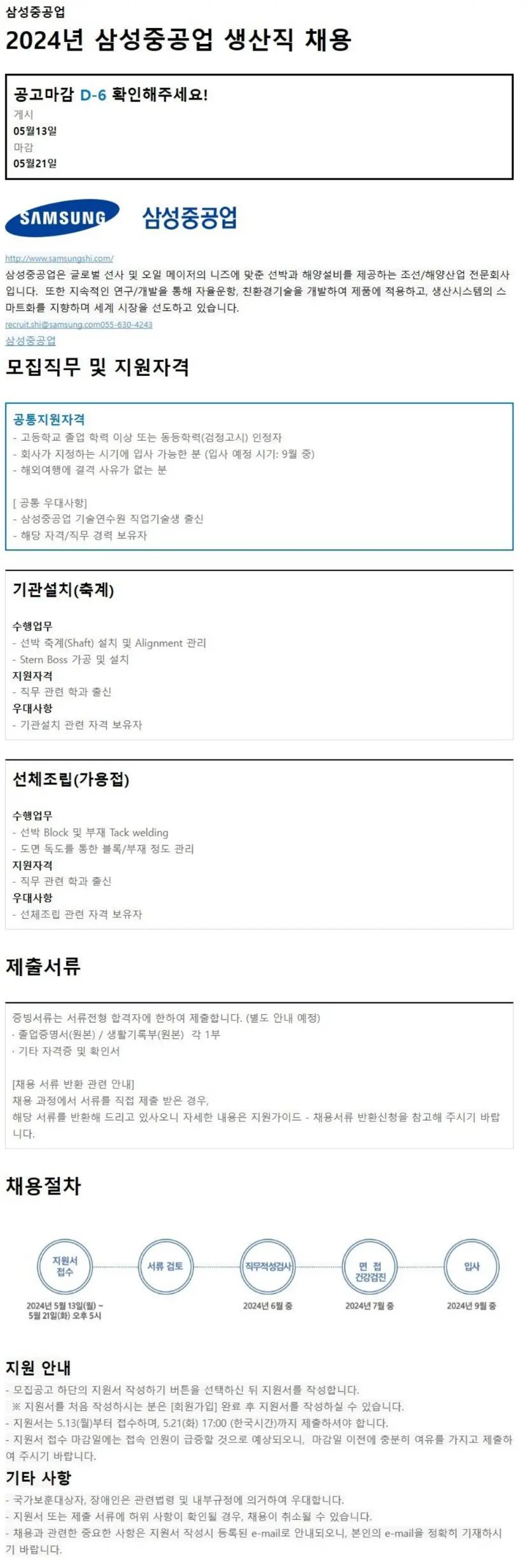 [삼성중공업] 2024년 생산직 채용 (~5/21) 작성자취뽀 I 스탭 01|작성시간24.05.17|조회수150 목록 댓글 0 글자크기 작게가 글자크기 크게가 [삼성중공업] 2024년 생산직 채용 (~5/21) 📌접수기간 : 24.5.13(월)~ 24.5.21(화) 📌고용형태 : 정규직📌접수방법 : 홈페이지 지원📌지원하기 : (클릭) 다음검색 현재 게시글 추가 기능 열기 북마크 공유하기 신고 센터로 신고 댓글 댓글 0 댓글쓰기 답글쓰기 댓글 리스트