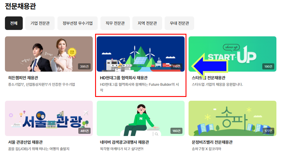 전문 채용관에 들어가면 잡코리아가 준비한 HD현대그룹 협력회사 채용관이 보입니다!