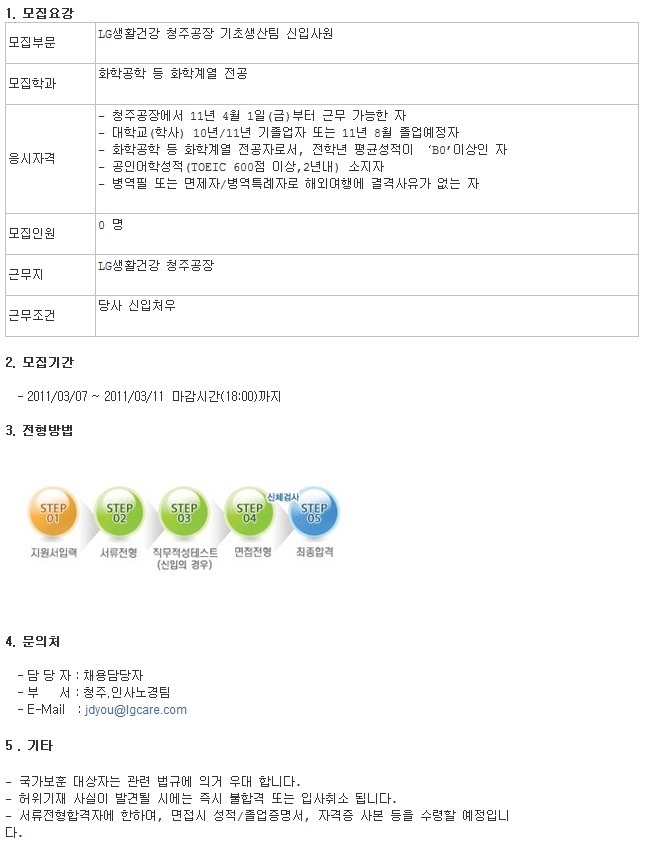 [채용공고][LG생활건강] LG생활건강 청주공장. 기초생산팀 신입사원 채용(~3/11) 작성자[운영자]취뽀JENA|작성시간11.03.07|조회수1,612 목록 댓글 3 글자크기 작게가 글자크기 크게가 [LG생활건강] LG생활건강 청주공장. 기초생산팀 신입사원 채용(~3/11) 다음검색 현재 게시글 추가 기능 열기 북마크 공유하기 신고 센터로 신고 댓글 댓글 3 댓글쓰기 답글쓰기 댓글 리스트 작성자ㅋㅋ1432 | 작성시간 11.03.08 LG^^ 작성자딜리버리서비스 | 작성시간 11.03.16 여기 서류 발표 났나요? 작성자크로시스 | 작성시간 11.04.01 면접 봤는데 혹시 연락 오신분 있나요?? 댓글 전체보기