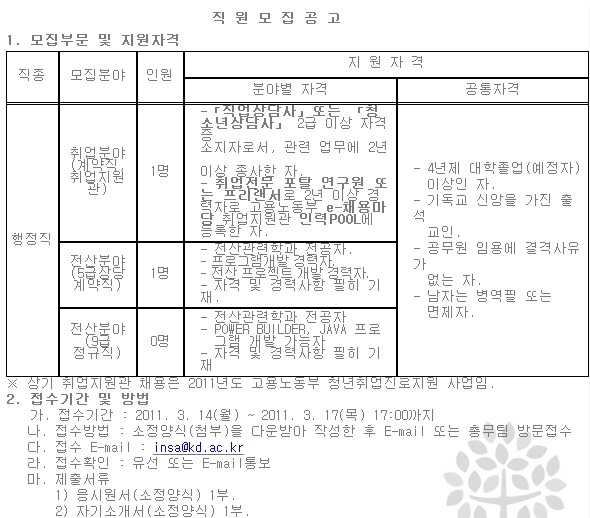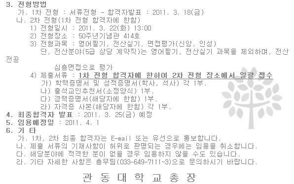 [채용공고][관동대학교] 직원모집공고 (3/14~3/17) 작성자[운영자]취뽀JENA|작성시간11.03.11|조회수1,189 목록 댓글 2 글자크기 작게가 글자크기 크게가 [관동대학교] 직원모집공고 (3/14~3/17) 다음검색 현재 게시글 추가 기능 열기 북마크 공유하기 신고 센터로 신고 댓글 댓글 2 댓글쓰기 답글쓰기 댓글 리스트 작성자또르갱 | 작성시간 11.03.15 가고싶어요 작성자크라이 | 작성시간 11.03.16 지원하세요.~ ㅋ 댓글 전체보기