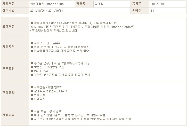 [채용공고][호텔신라 채용] 생활레저사업부 삼성계열사 Fitness Center 체련 강사 모집 (~10/13) 작성자[운영자]취뽀SUN|작성시간11.10.06|조회수350 목록 댓글 0 글자크기 작게가 글자크기 크게가 [호텔신라 채용] 생활레저사업부 삼성계열사 Fitness Center 체련 강사 모집 (~10/13) 대한민국 넘버원, 143만 회원과 함께하는 Daum 카페 취업뽀개기 모든 취업정보 여기에! 빠르고 정확한 채용정보 , 이제 취업뽀개기 SNS가 함께합니다. 다음검색 현재 게시글 추가 기능 열기 북마크 공유하기 신고 센터로 신고 댓글 댓글 0 댓글쓰기 답글쓰기 댓글 리스트