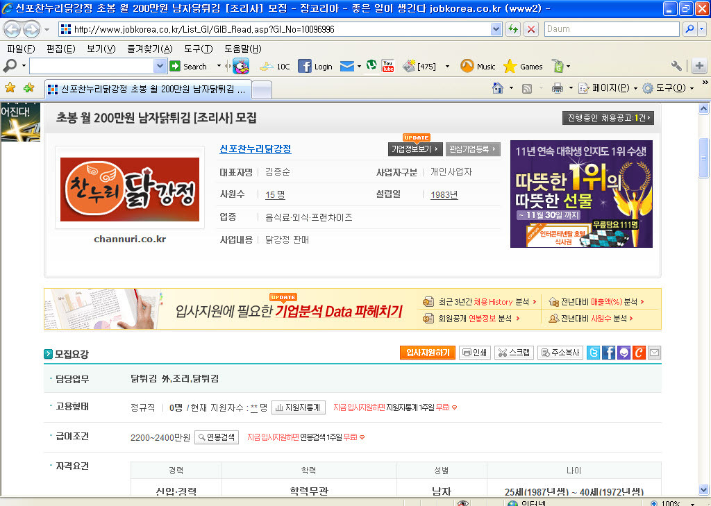 익게이들아 연봉 2,400에 신포찬누리 닭강정 닭튀김 조리사 모집한다... 작성시간11.11.19|조회수297 목록 댓글 2 글자크기 작게가 글자크기 크게가 여기 대한민국 넘버원, 144만 회원과 함께하는 Daum 카페 취업뽀개기 모든 취업정보 여기에! 빠르고 정확한 채용정보 , 이제 취업뽀개기 SNS가 함께합니다. 다음검색 현재 게시글 추가 기능 열기 북마크 신고 센터로 신고 댓글 댓글 2 댓글쓰기 답글쓰기 댓글 리스트 작성시간 11.11.19 너가 딱이네 작성자 본인 여부 작성자 작성시간 11.11.19 삼성SDS, LG CNS, SK C&C 다니는 놈들은 생각을 잘해봐라 댓글 전체보기