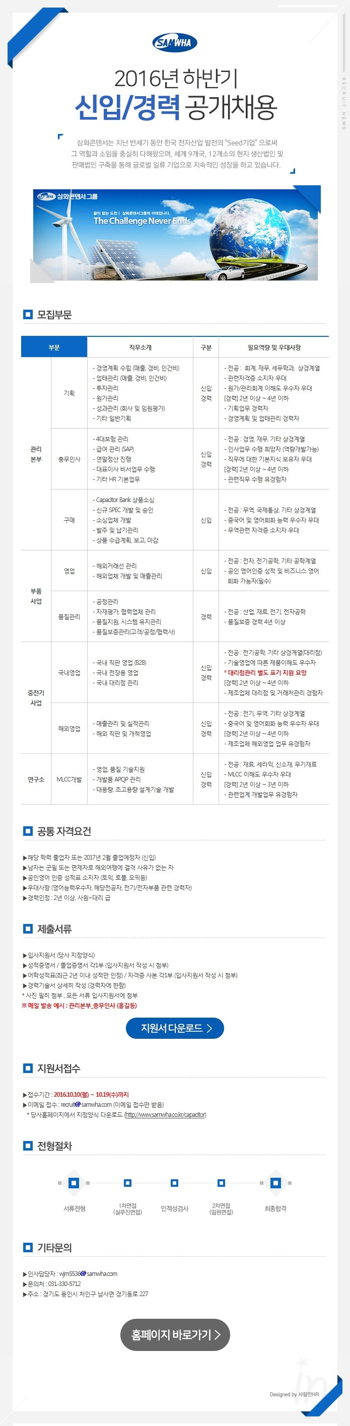 삼화콘덴서공업 채용 2016년 하반기 신입/경력 공개채용이며,