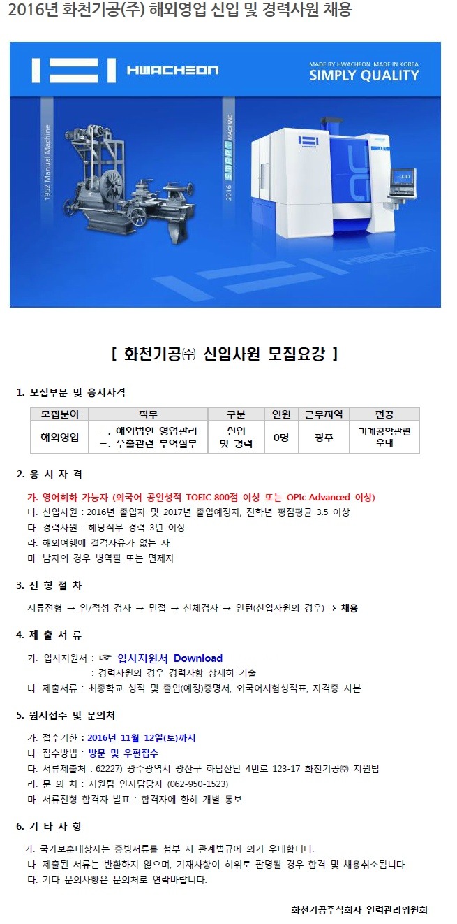 [화천기공 채용] 화천기공 채용 2016년 해외영업 신입 및 경력사원 채용