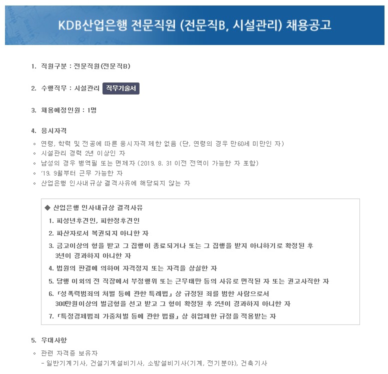 [KDB산업은행] 전문직원(전문직B, 시설관리) 채용 공고 (~6/24)