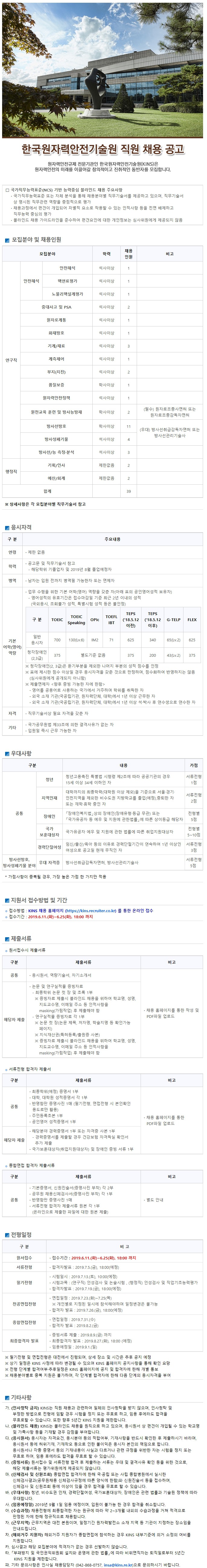 [한국원자력안전기술원] 한국원자력안전기술원 2019년 하반기 공개채용 (~6/25) 작성자중고나라의어린이|작성시간19.06.12|조회수241 목록 댓글 0 글자크기 작게가 글자크기 크게가 *아래 양식을 지켜주세요.[한국원자력안전기술원] 한국원자력안전기술원 2019년 하반기 공개채용 (~6/25)※홈페이지주소:http://www.kins.re.kr/news.do?seq=2135&menu_item=notice&mode=View핫한 취업뽀개기 게시판 보고 취업에 한걸음 더! 다음검색 현재 게시글 추가 기능 열기 북마크 공유하기 신고 센터로 신고 댓글 댓글 0 댓글쓰기 답글쓰기 댓글 리스트