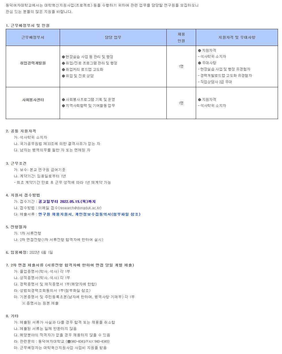 [동덕여대] 연구원 채용(~5.19) 작성자동덕여대 연구원 채용|작성시간22.05.11|조회수42 목록 댓글 0 글자크기 작게가 글자크기 크게가 📌접수기간 : ~ 22.05.19(목)📌고용형태 : 계약직📌접수방법 : 이메일 제출(research@dongduk.ac.kr)(양식1)연구원 채용지원서.hwp83.50KB(양식2)개인정보수집동의서.hwp55.50KB(양식3) 성범죄 경력 조회 동의서.hwp13.50KB 첨부파일첨부된 파일이 4개 있습니다. png 파일 image.png 다운로드 hwp 파일 (양식3) 성범죄 경력 조회 동의서.hwp 다운로드 hwp 파일 (양식1)연구원 채용지원서.hwp 다운로드 hwp 파일 (양식2)개인정보수집동의서.hwp 다운로드 다음검색 현재 게시글 추가 기능 열기 북마크 공유하기 신고 센터로 신고 댓글 댓글 0 댓글쓰기 답글쓰기 댓글 리스트