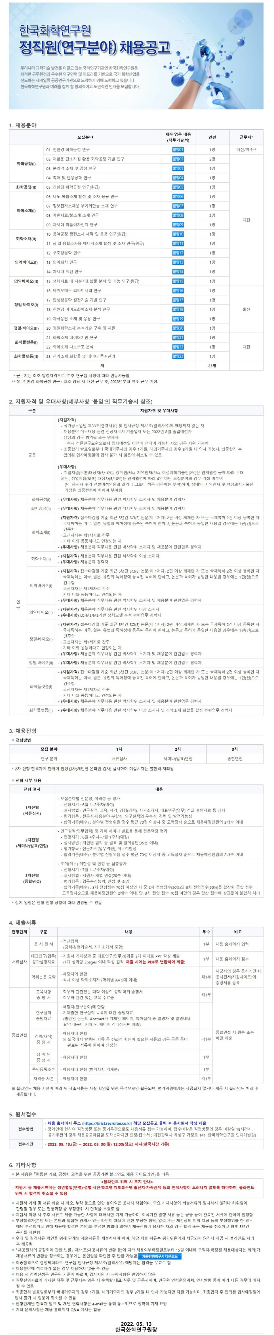 [한국화학연구원] 2022년 상반기 정직원(연구분야) 채용 공고 (~05/30)