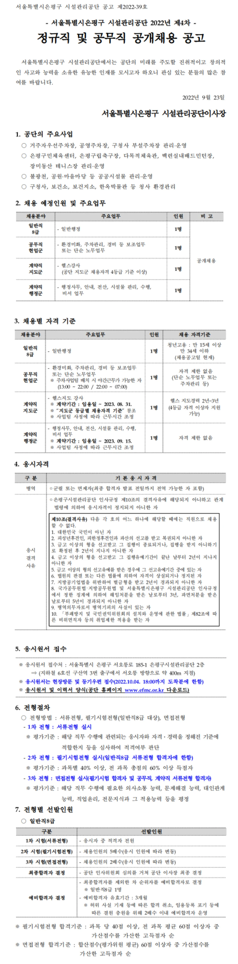[은평구시설관리공단] 2022년 제4차 정규직 및 공무직 공개채용 (~10/04)