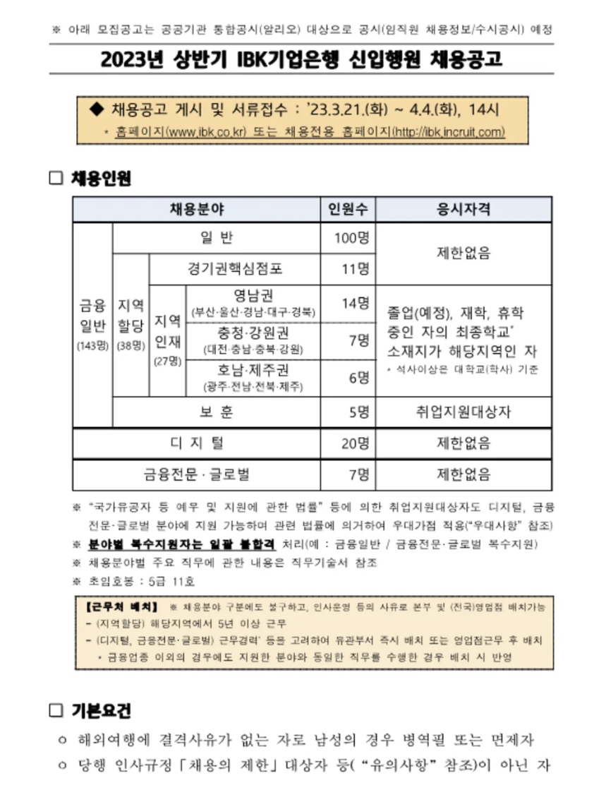 [IBK기업은행] 정규직 신입(일반, 금융일반 등) 채용 (~04/04)