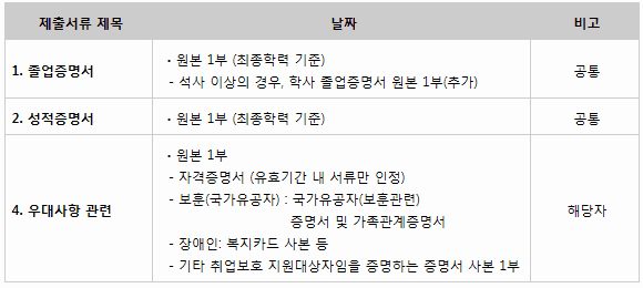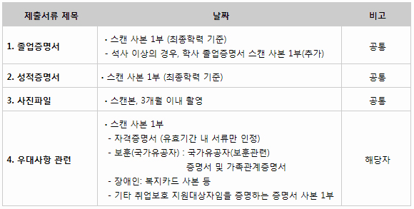 [졸업증명서, 성적증명서, 사진파일, 우대사항 관련 증빙 서류(해당자)]