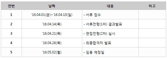 - 서류 전형(1차) 합격자 발표 예정일 : 2016. 4. 14(목), 20:00한