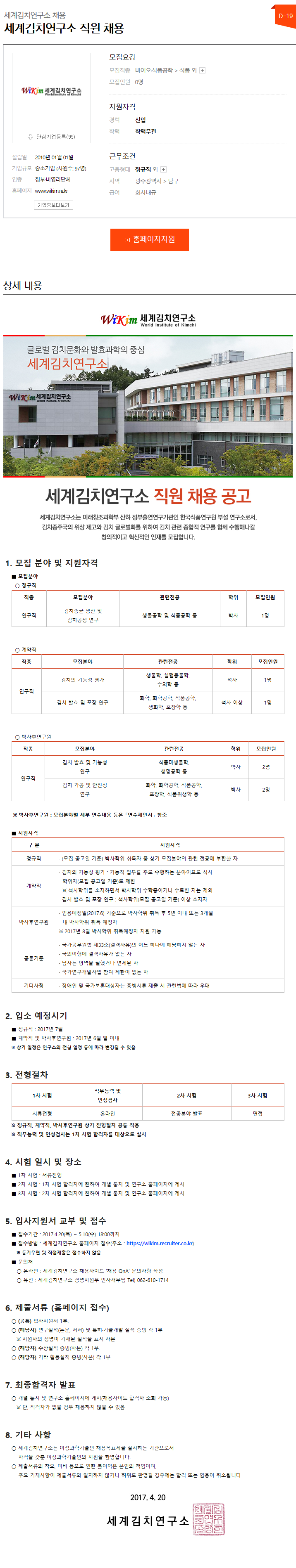 [세계김치연구소] 세계김치연구소 직원 채용