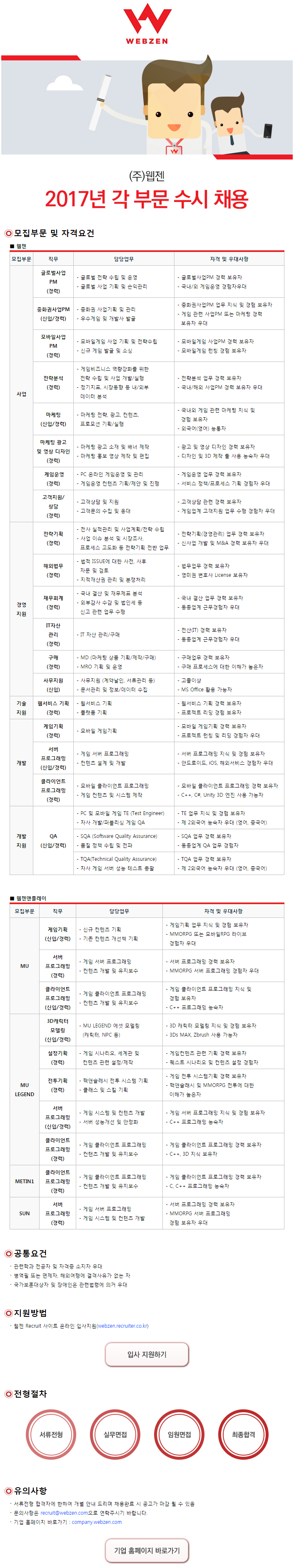 [웹젠 채용] 2017년 각 부문별 수시 채용
