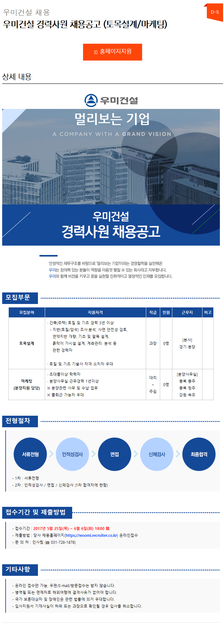 [우미건설] 우미건설 경력사원 채용공고 (토목설계/마케팅)