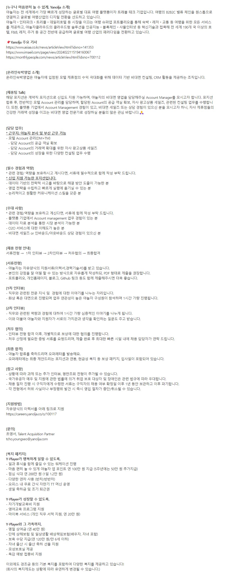 [야놀자] Account Manager - 비대면 영업 (1년 3개월, 계약직) (~채용 시 마감)