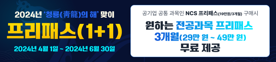 ● 프리패스 패키지 : 3개월부터 12개월까지, 공기업 기출 / 해설강의 무제한 + 공통 시험과목(한국사 / 일반상식)은 덤으로~