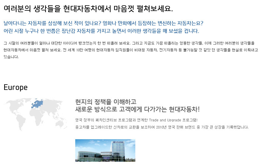 요즈음은 자동차 등록 대수 2,000만 돌파가 임박할 정도로 많은 사람이 자동차를 가지고 다닙니다. 연구개발 차량설계/평가에서 제가 관심이 있는 부분들에 대해 끊임없는 연구를 하면서 새로운 것을 창조하고 싶습니다. 자동차는 사람이 타는 것입니다. 그러므로 사람을 우선시해야 한다고 생각합니다. 타는 사람이 편해야 하며 안전해야 한다고 생각합니다. 제가 입사를 하게 된다면 이러한 신념을 지니고 회사의 밑바탕이 되어 신뢰받는 연구원이 될 것입니다.
