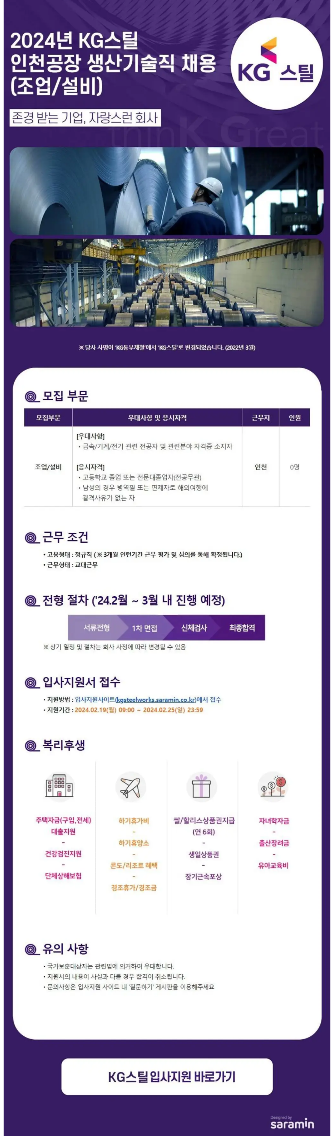 [KG스틸] 2024년 인천공장 생산기술직(조업/설비) 채용 (~02/25)