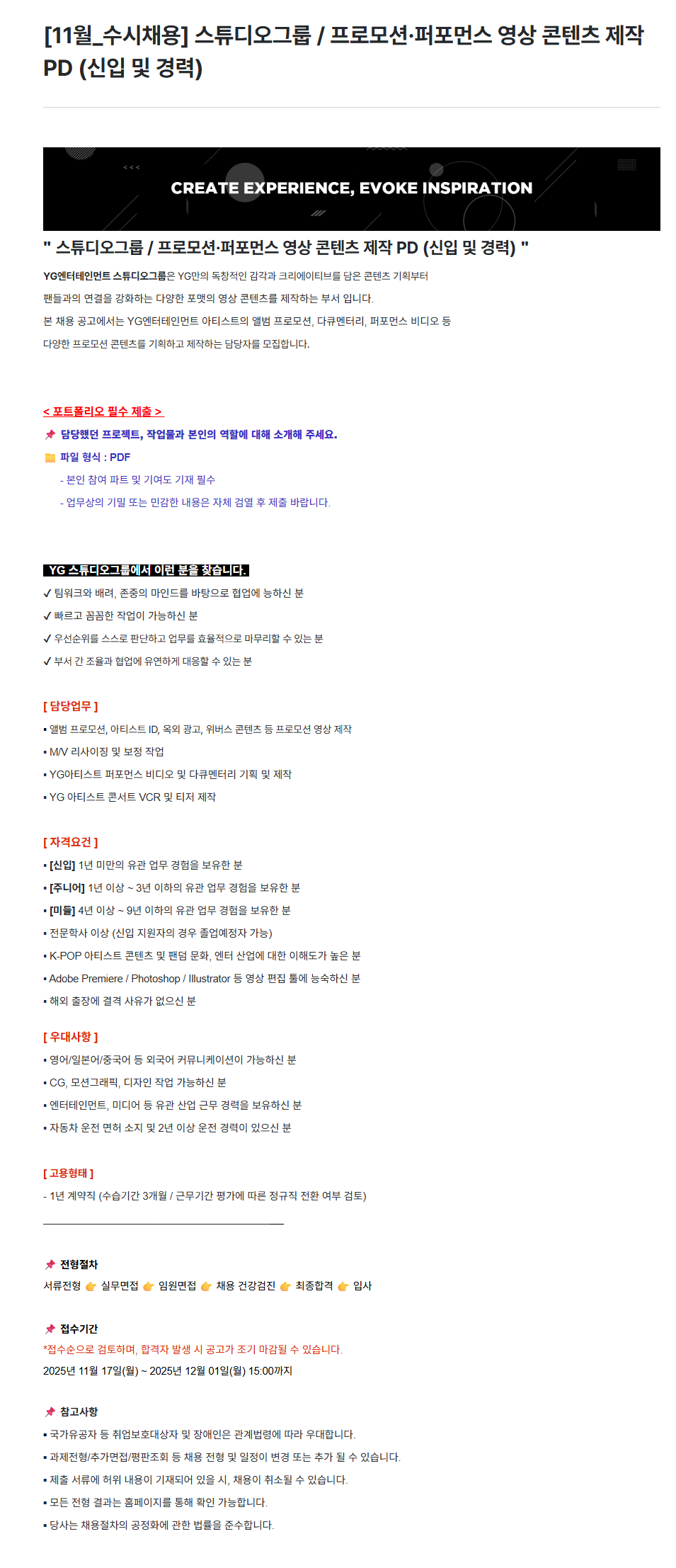 [YG엔터테인먼트] [YG엔터테인먼트 스튜디오그룹] 프로모션/퍼포먼스/영상 콘텐츠 제작 PD (신입 및 경력) (~12.01)