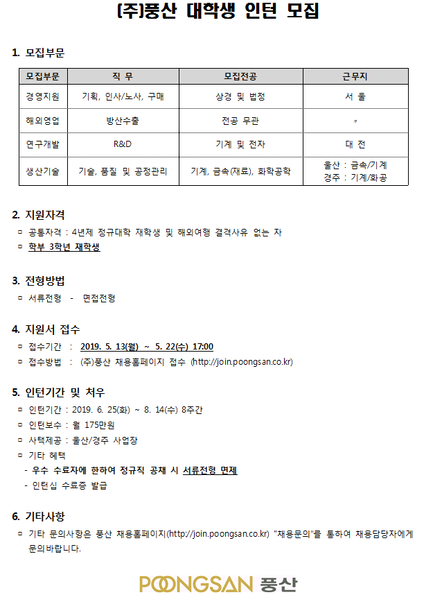 [(주)풍산] 2019년 하계 대학생 인턴 모집 (~5/22)