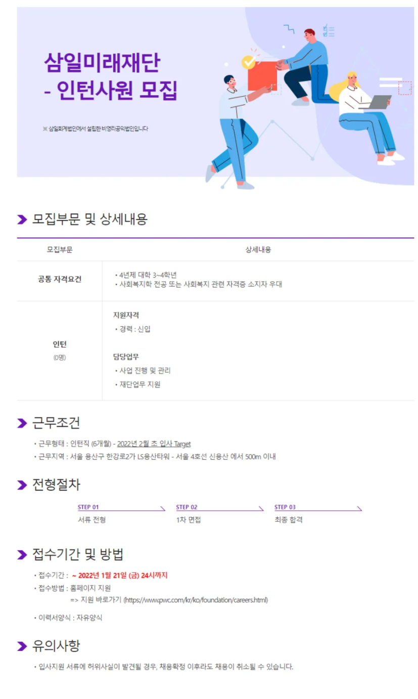 [삼일회계법인] 삼일미래재단 인턴사원 모집 공고 (~01/21) 작성자취뽀 I 채용정보|작성시간22.01.10|조회수17 목록 댓글 0 글자크기 작게가 글자크기 크게가 [삼일회계법인] 삼일미래재단 인턴사원 모집 공고 (~01/21) 📌접수기간 : 22.01.06(목)~ 22.01.21(금)📌고용형태 : 인턴📌접수방법 : 홈페이지 지원📌지원하기 : (클릭) 다음검색 현재 게시글 추가 기능 열기 북마크 공유하기 신고 센터로 신고 댓글 댓글 0 댓글쓰기 답글쓰기 댓글 리스트